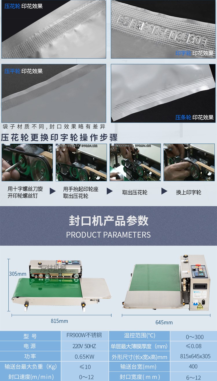 FR-900W全自動封口機,可以輸送臺加寬至400mm,承重加至10kg適用大米袋等較大較重產(chǎn)品封口。